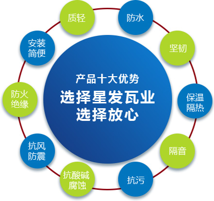 公司主要產品有《星發(fā)牌》合成樹脂瓦、APVC防腐耐候復合瓦、APVC發(fā)泡隔熱瓦、PVC半透明瓦、PVC防腐隔熱瓦、PVC防腐瓦、PVC防腐平板、PVC條紋板和ASA/PVC超耐候復合瓦等產品。產品一經推出,已被廣泛應用于國內各類平改坡項目和大型工業(yè)項目,遠銷歐洲、亞洲、美洲和非洲等國外市場,還獲選為廣州亞運會、深圳大運會、四川災后重建等工程項目的應用產品。公司在不斷創(chuàng)新和改革的基礎上,力求以更好的產品、優(yōu)良的服務,用心、專心服務好每一個客戶。